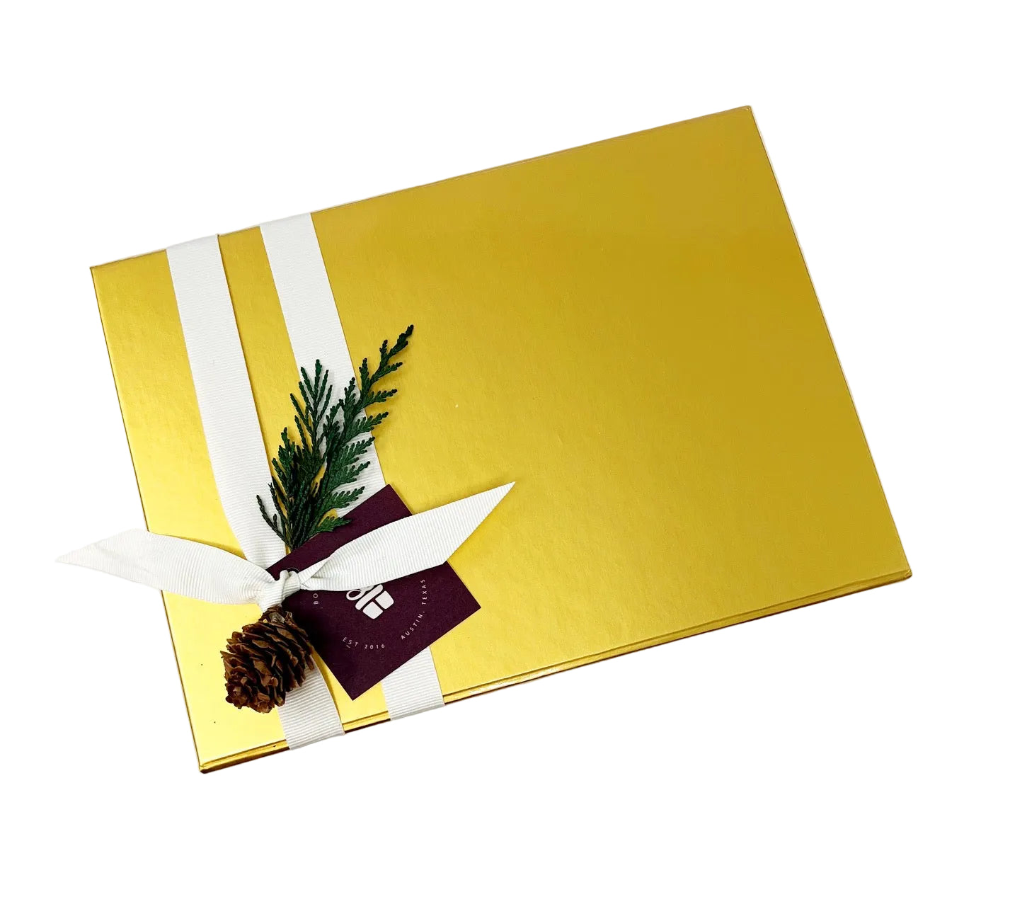 • Reusable + Keepsake gold gift box adorned with festive ribbon and dried holiday greenery