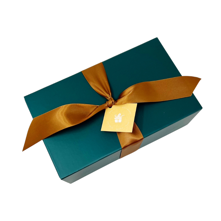 - Green gift box adorned with festive ribbon, mini pinecones and dried holiday greenery