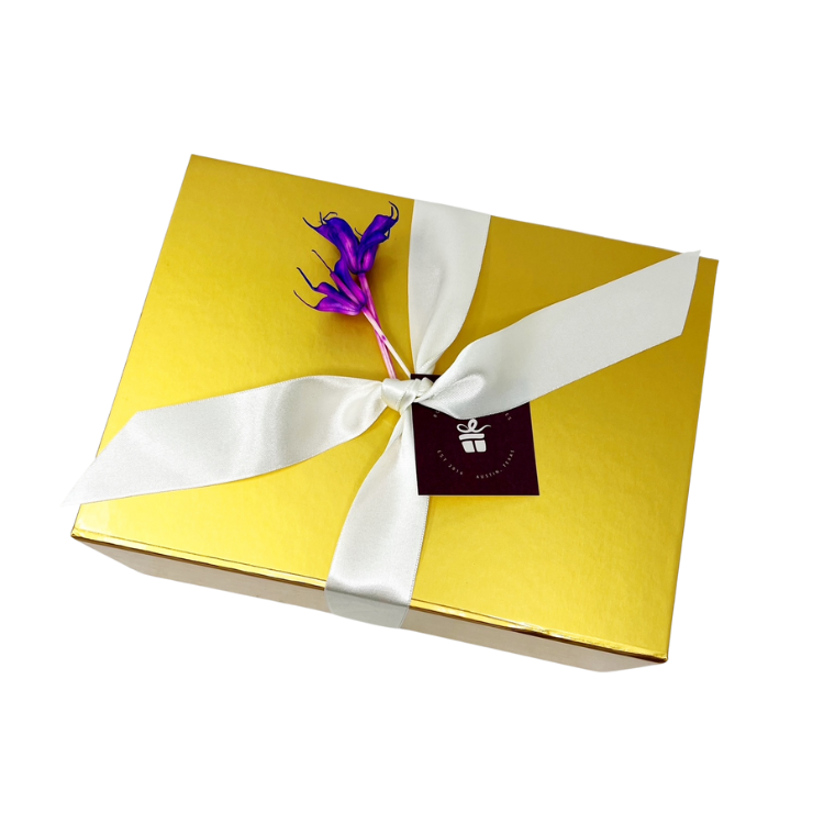 - Keepsake + reusable gold magnetic gift box tied up with ivory ribbon and a few springs of dried bunny tails.