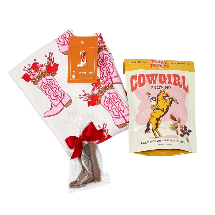 Being from Texas, we couldn't help ourselves with this Cowgirl-themed gift box. The perfect bachelorette gift, birthday gift or any excuse to quote the lyrics from "She's from Texas, I can tell" - yeehaw! Includes: