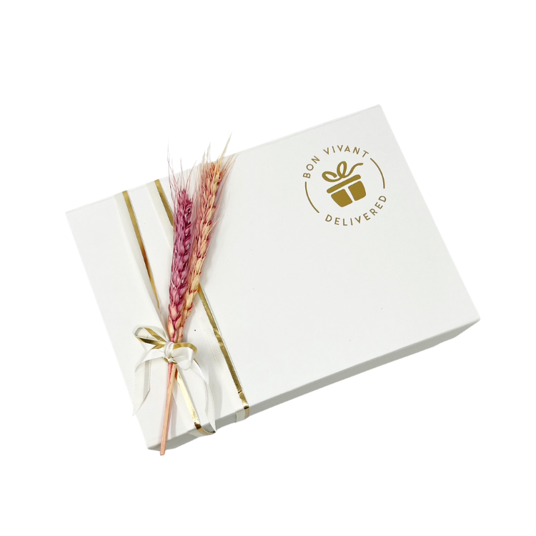 - Keepsake + reusable BV branded gift box, adorned with ribbon and pink dried wheat