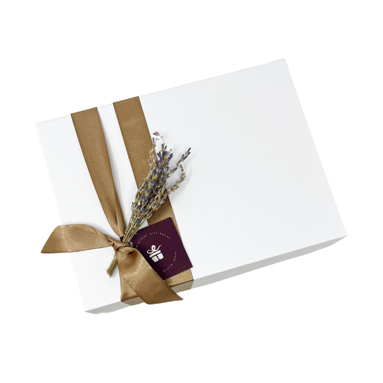 - Recyclable + reusable ivory gift box adorned with ribbon and a small dried lavender bundle